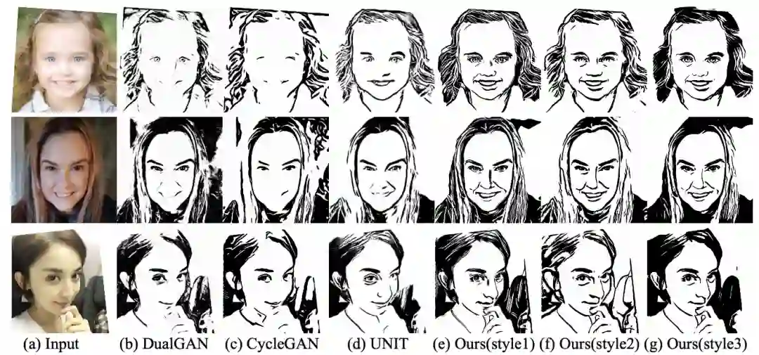论文提出一种基于非成对数据的从人脸照片生成肖像线条画的方法,该方法可以(1)使用单个网络生成多种风格的高质量肖像线条画,以及(2)生成训练数据中未出现的「新风格」肖像画。