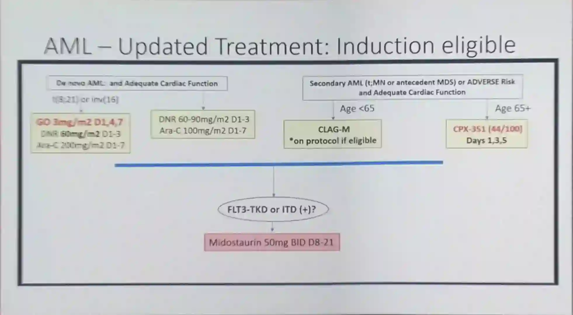 在2015年ASH会议上,一项国际多中心临床试验显示:米哚妥林(PKC412)与化疗联合治疗FLT-3突变的急性髓系白血病,可提高此类患者的总体生存时间(OS),这个临床研究的最终结果发表在今年的新英格兰杂志。基于这个研究,今年FDA批准:米哚妥林(PKC412)用于FLT-3突变的急性髓系白血病患者的治疗。在本届ASH会,FDA对米哚妥林的临床应用做了进一步的说明,基于目前的临床研究结果,米哚妥林与化疗联合提高了急性髓系白血病的疗效,而后续的维持治疗并没有提高急性髓系白血病的临床疗效,相关的结果本届ASH也有报道。因此FDA认为,米哚妥林的应用应与化疗联合,维持治疗并不在获批的适应症。此外,未来的FLT-3抑制还有奎扎替尼(AC220)、Gilteritinib (ASP2215)以及Crenolanib等。这3种药物均为针对FLT-3的特异性抑制剂,能更好地抑制FLT3激酶的活性,其与化疗药物的联合应用可能大幅提高对FLT-3突变患者的疗效。今年ASH会议一项口头报告显示:将Crenolanib与DA方案联合治疗FLT-3突变的髓系白血病患者,其2年的总生存率达79%。