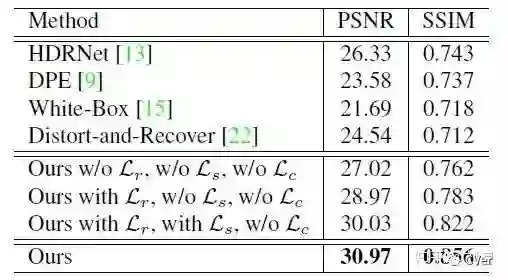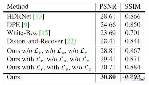 使用了两个常用的度量标准(即,PSNR和SSIM)来定量评估我们的网络性能,根据预测结果和相应的专家润色图像之间的颜色和结构相似性。虽然这不是绝对的指示性,但总的来说,高的PSNR和SSIM值对应着相当好的结果。