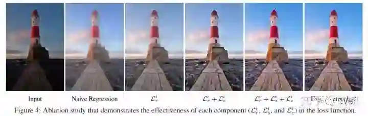直观地说,平滑度损失鼓励光照在小梯度的像素上是平滑的,而在大梯度的像素上是不连续的。有趣的是,对于曝光不足的照片,图像内容和细节往往很弱。较大的梯度更可能是由不一致的光照造成的。如图4中的第4幅图像所示,通过进一步加入平滑度损失,我们恢复了良好的图像对比度,与仅重建损失的结果相比,细节更加清晰。