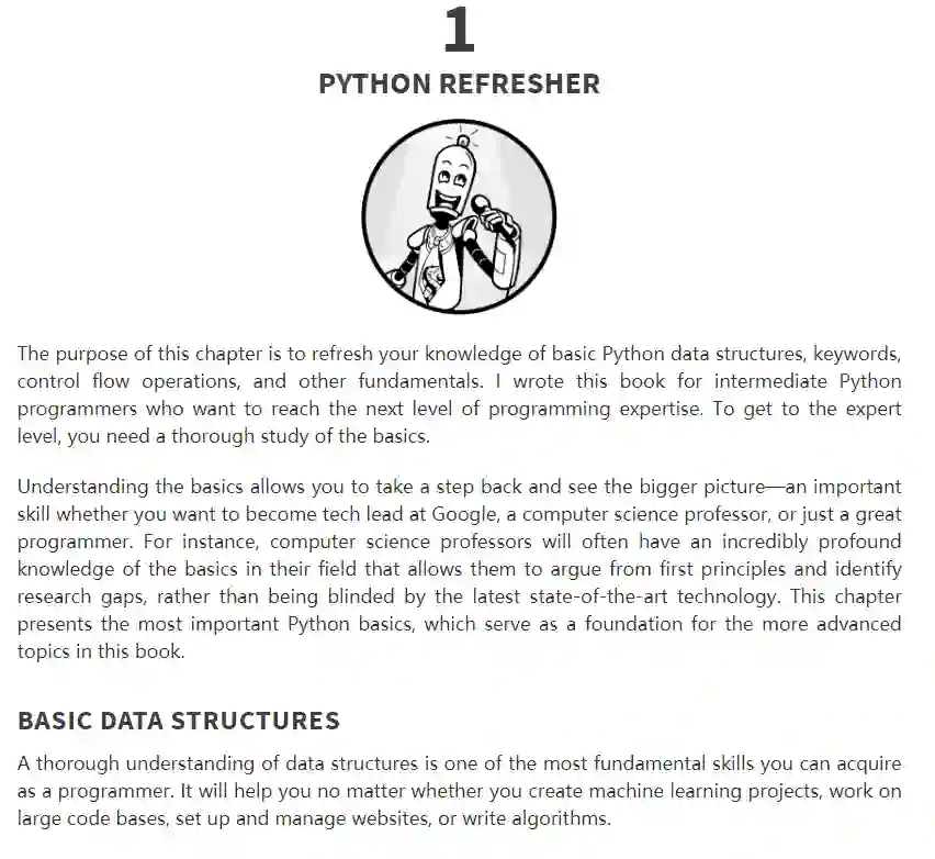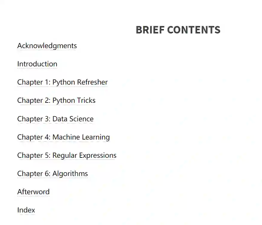 本书共分五章,内容包括技巧和技巧、正则表达式、机器学习、核心数据科学主题和有用的算法。对一行程序的详细解释将介绍关键的计算机科学概念,并提高您的编码和分析技能。您将了解高级Python特性,如列表理解、切片、lambda函数、正则表达式、映射和缩减函数以及切片分配。您还将学习如何: