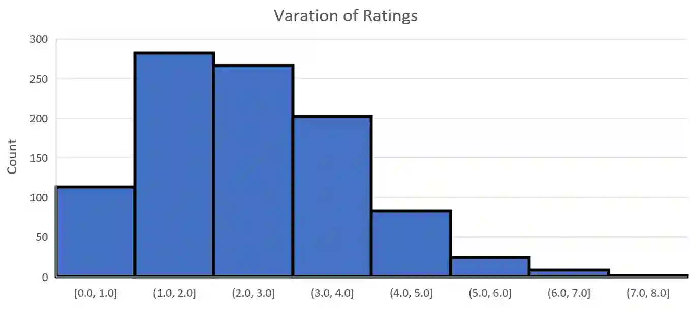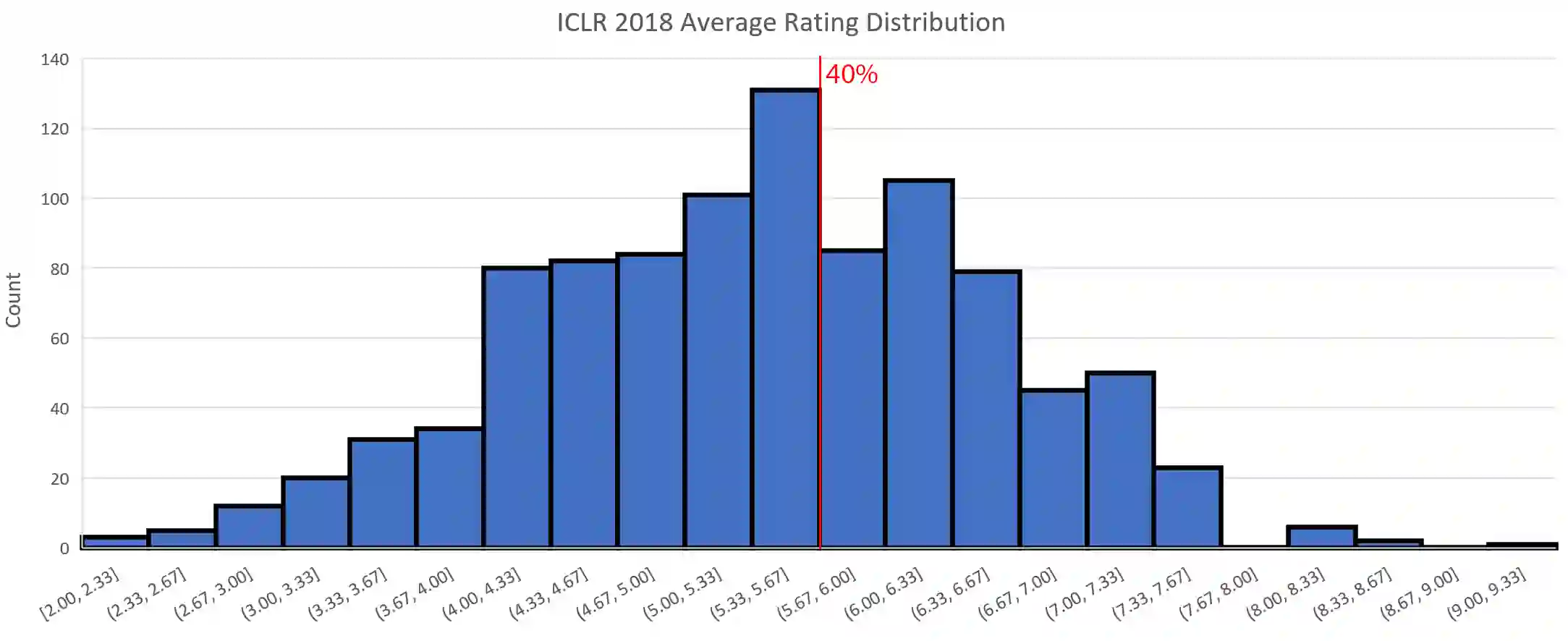 对于大多数论文(87%)而言,最高评分与最低评分之间的分差不超过3分。由此可见,在深度学习领域,学术共同体的分歧并不是特别大。