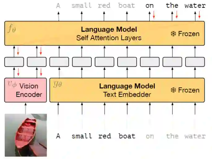 整个模型类似于多模态模型中的双流架构,其中text embedder和self attention layers的参数都是固定不动的,只有vision encoder的参数会进行更新。每一张图片经过NF-ResNet-50编码之后再经过一个线性层映射称为D*n维的向量,然后拆散成n个embeddings,上图展示了n=2的情形。模型在conceptual captions数据集上进行训练,输入image,自回归地输出captions,相当于是一个conditional text generation任务。