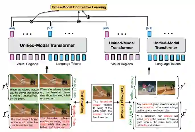 本文的亮点是在预训练阶段通过检索的方式,在一个统一的Transformer架构下同时使用单模态和多模态数据,进行跨模态的对比学习,并通过一系列增强方式产生各种粒度的正负样本,从而使得图文的向量表示不仅有粗粒度特征,也有细粒度的特征。模型结构如下:
