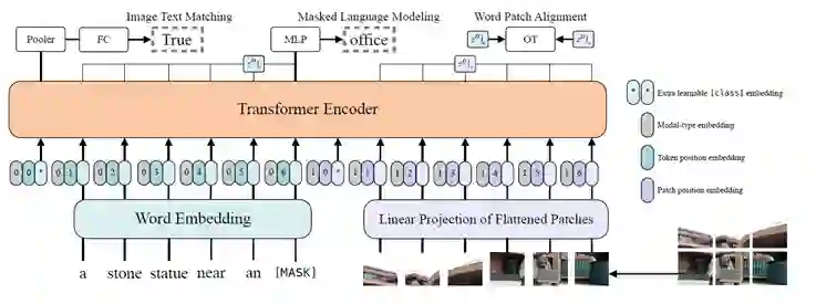 在建模文本和图片交互时,ViLT采用了单流架构,Transformers用预训练的ViT-B/32初始化(文中说也实验了BERT初始化但是不work)。模型结构如下: