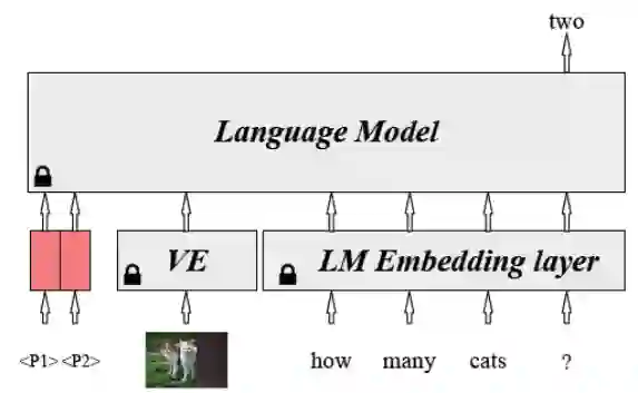 本文是对上一篇文章中的image-conditional prefix tuning的改进工作。Frozen中的image encoder同时完成了两个目标:提取视觉特征、对齐图文空间的表示。本文将这两个目标解耦,image encoder只负责编码图像特征,而对齐图文空间表示的任务交给prompt向量来做。这样视觉编码器的参数也变成固定的了,只有prompt向量的参数是可训练的。这样做有两个好处:(1) 整个架构更加模块化,可以灵活调整视觉编码器,也可以灵活地加入其他模态;(2) 实现了更高的参数效率,视觉编码器中的大量参数都可以冻结,只需要调整prompt向量即可。模型结构如下: