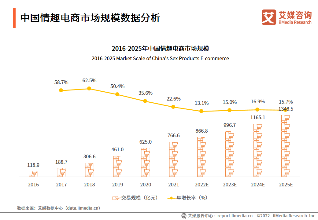 艾媒咨询上述报告显示,2016年以来,中国情趣电商市场交易规模保持增长态势。数据显示,2016年,中国情趣电商市场规模只有118.9亿元,到2021年,已经增长到766.6亿元,预计2022年达到866.8亿元,六年增长超七倍。