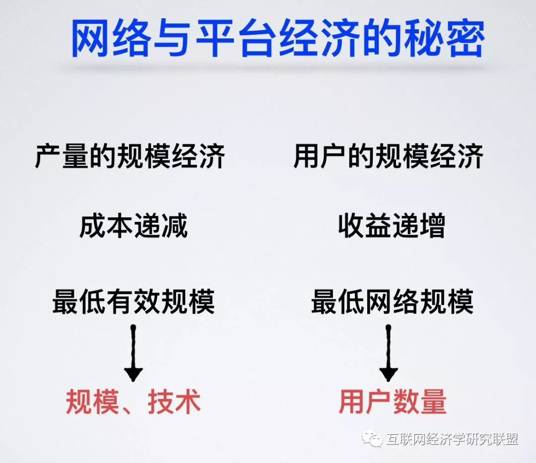 从厂商的角度出发,互联网平台经济与传统经济存在两个方面的主要区别,一是由生产的规模经济到用户的规模经济,二是由边际成本递减到边际收益递增。