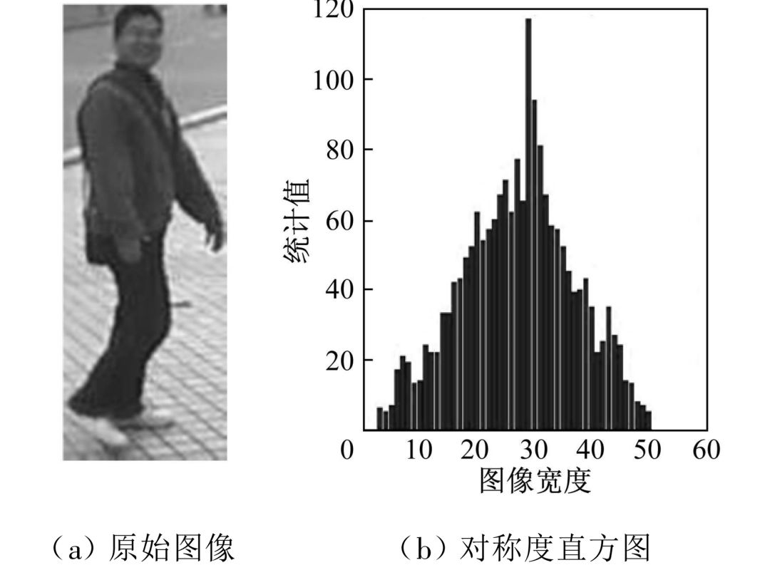 在确定了兴趣区域的范围后,本文利用行人具有边缘对称性的特征,采用文献 [7] 中的方法,进一步对提取区域进行预处理,实现对称性分析。图 7 所示为对称度实验结果。其中,对称度直方图的长度代表其对称性统计值,最大值出现的位置可认为是对称中心。
