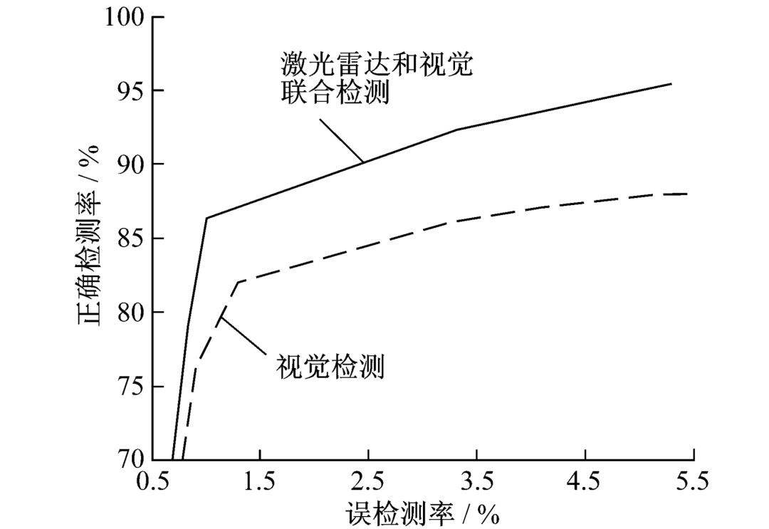 由图可见,由于通过激光雷达有效划分了兴趣区域,所以,联合检测结果比单一使用视觉的检测方法更好。当误检率在 4% 左右时,行人检测率可以达到 93% 左右,最高检测率可以达到 95%。另外,由于激光雷达不受光照等天气因素的影响,其鲁棒性较强;而目前普遍采用的基于机器学习的行人检测方法,需要对样本进行学习,受光照条件影响较大,很难应用于实时检测中。通过实验可以看出,激光雷达和视觉联合检测方法可以取得较好的结果。