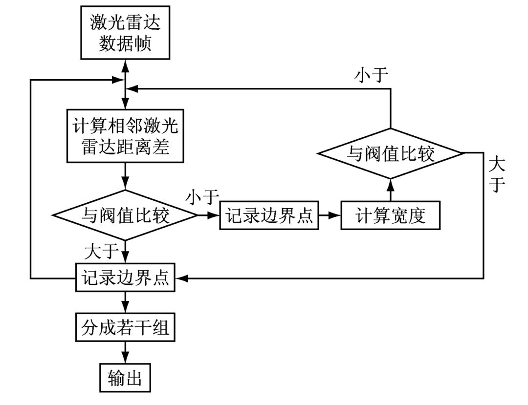 通过以上判据,可以有效地分割激光雷达数据,使原本属于同一物体的点簇聚为一类。但在行人检测中,当出现并排走的行人时,很可能将并排行人聚为一类,将原本多个行人视为单个行人而无法对行人进行行为分析。因此,本文提出一种根据行人宽度信息的改进型聚类算法,流程如图 4 所示,当聚类宽度超过一定范围时重新进行聚类。