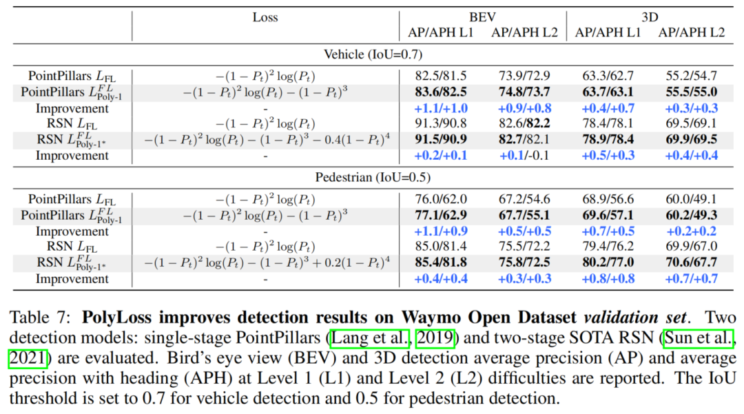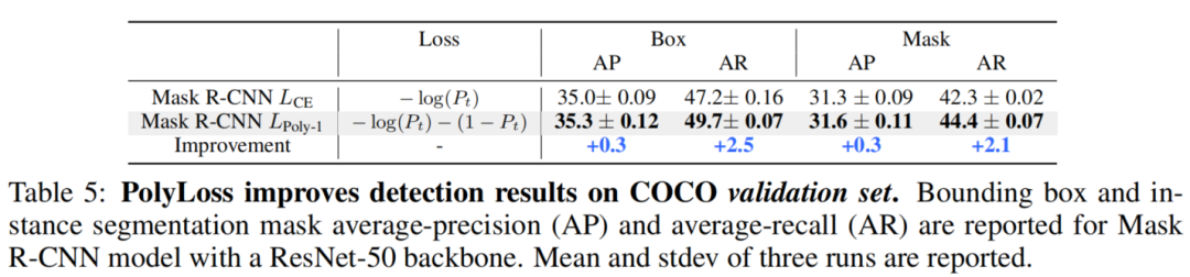 PolyLoss内的最优选择确实依赖于任务和数据集。只需引入一个额外的超参数和添加一行代码,PolyLoss在二维图像分类、实例分割、目标检测和三维目标检测任务上都明显优于Cross-entropy loss和Focal loss。