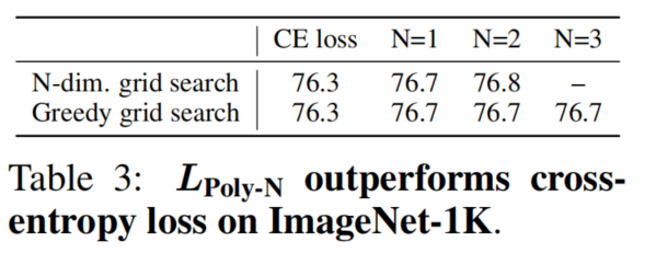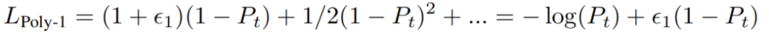 如前一节所示,作者发现调整第1个多项式项会带来最显著的增益。在本节中,进一步简化了Poly-N公式,并重点计算了Poly-1,其中只修改了Cross-entropy loss中的第1个多项式系数。
