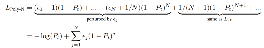 为了解决这一问题,作者提出扰动交叉熵损失中的重要的多项式系数(前N项),同时保持其余部分不变。将所提出的损失公式表示为 ,其中N表示将被调整的重要系数(前N项)的数量。