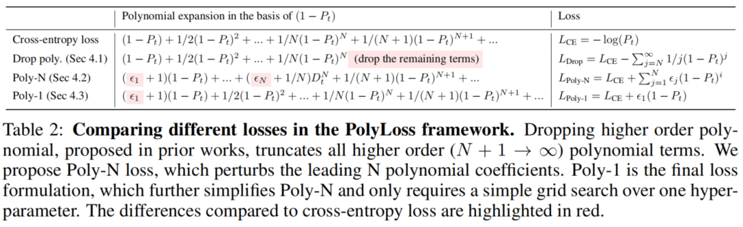 New loss formulation:评估了垂直移动多项式的不同方法,以简化超参数搜索空间。提出了一个简单而有效的Poly-1损失,它只引入了一个超参数和一行代码。