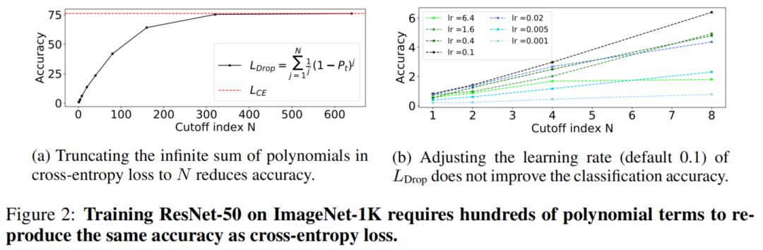 如图2a所示,需要求和超过600个多项式项才能匹配Cross-entropy loss的精度。值得注意的是,去除高阶多项式不能简单地解释为调整学习率。为了验证这一点,图2b比较了在不同的截止条件下不同学习率下的性能:无论从初始值0.1增加或减少学习率,准确率都会变差。