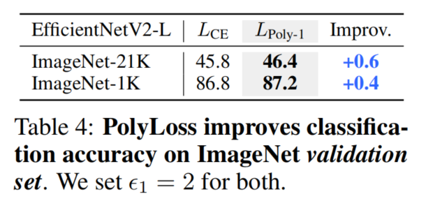 注意,所有训练超参数都针对Cross-entropy loss进行了优化。即便如此,对Poly-1公式中的第1个多项式系数进行简单的网格搜索可以显著提高分类精度。作者还发现对LPoly-1的其他超参数进行优化还可以获得更高的精度。