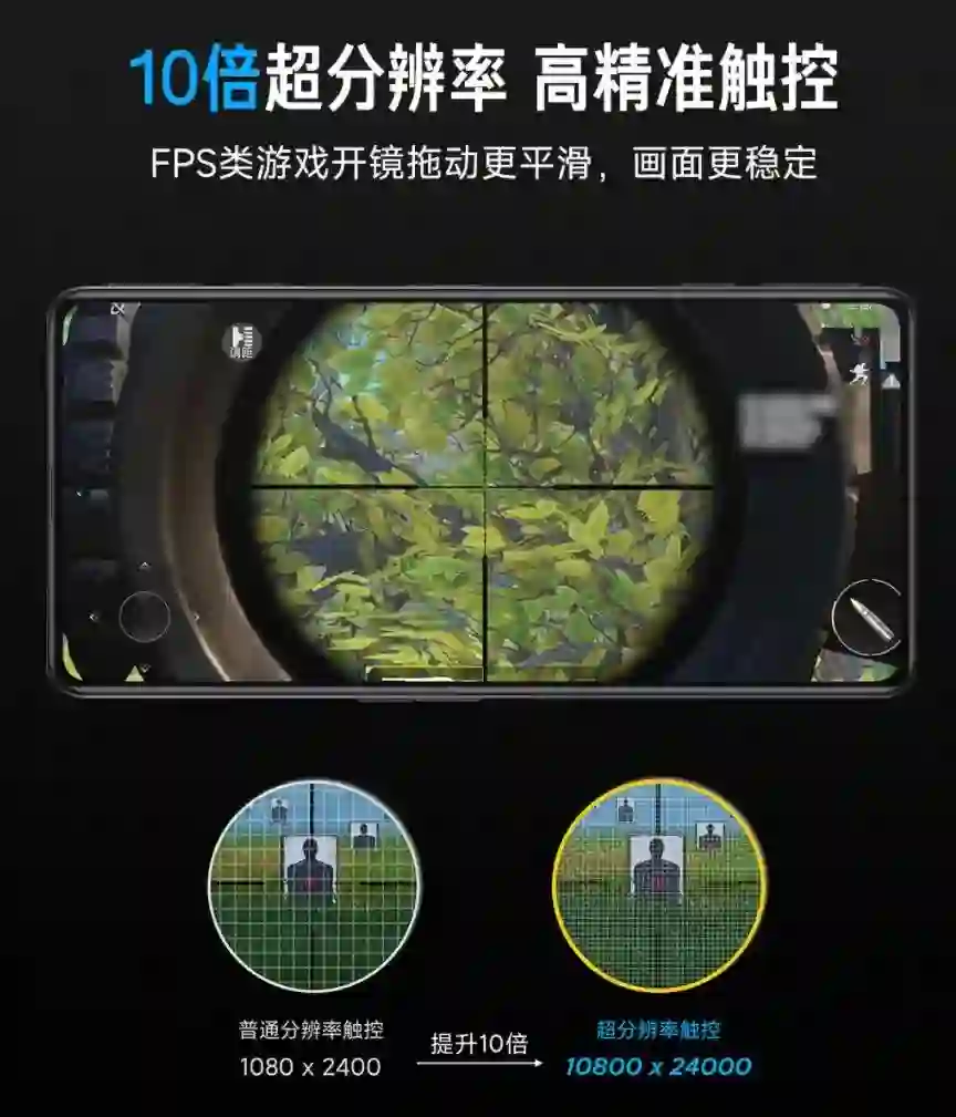 针对游戏体验,Redmi K50 电竞版搭载了 10 倍高精准触控,可以将屏幕触控分区提升至 24000 x 10800,在精准度要求更高的游戏里,拖动更精准。