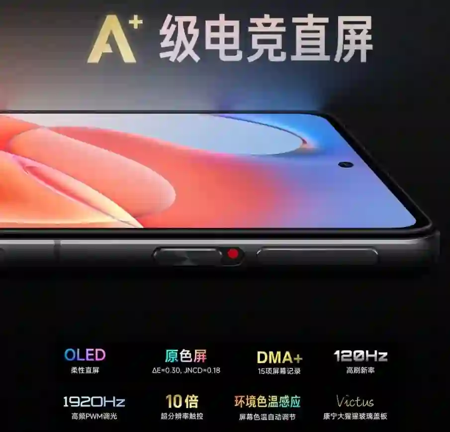 Redmi K50 电竞版采用华星光电柔性 OLED 直屏,覆盖康宁大猩猩 Victus 玻璃,这块屏幕拥有 DisplayMate A+ 认证并达成 15 项纪录,屏幕尺寸为 6.67 英寸,分辨率 2400 x 1080,支持 120Hz 刷新率、480Hz 触控采样率,对比度可达 500 万:1,支持 HDR10+、DCI-P3 色域、MEMC 运动补帧。该屏幕支持 1920Hz 高频 PWC 调光,对人眼更友好。