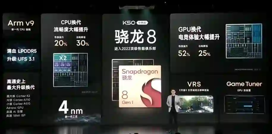 性能方面,Redmi K50 电竞版搭载高通全新一代骁龙 8,配合 8/12GB LPDDR5 内存、128/256GB UFS 3.1 存储。新一代骁龙 8 基于三星 4nm 工艺,升级新一代 Armv9 架构、Cortex-X2 超大核心、新一代 Adreno 730 GPU,AI 引擎与图像处理器均有大幅升级。根据 GFXBench 曼哈顿测试,骁龙 8 的 GPU 比骁龙 888 提升了 52%。此外,Redmi K50 电竞版还搭载 IO Turbo 2.0 技术,解压缩性能提高 100%,文件拷贝性能提高 300%。