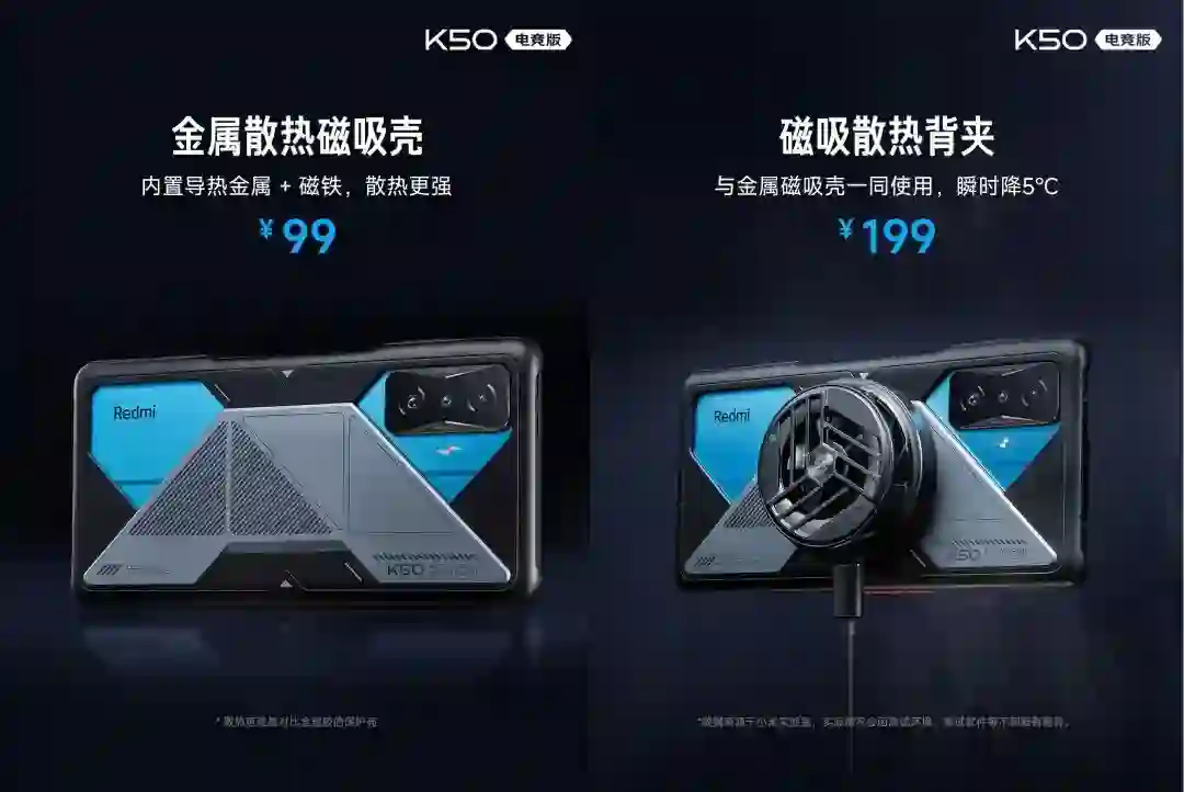 应景的,Redmi 还在发布会上推出了两款散热背夹,售价分别是 99 元和 199 元。