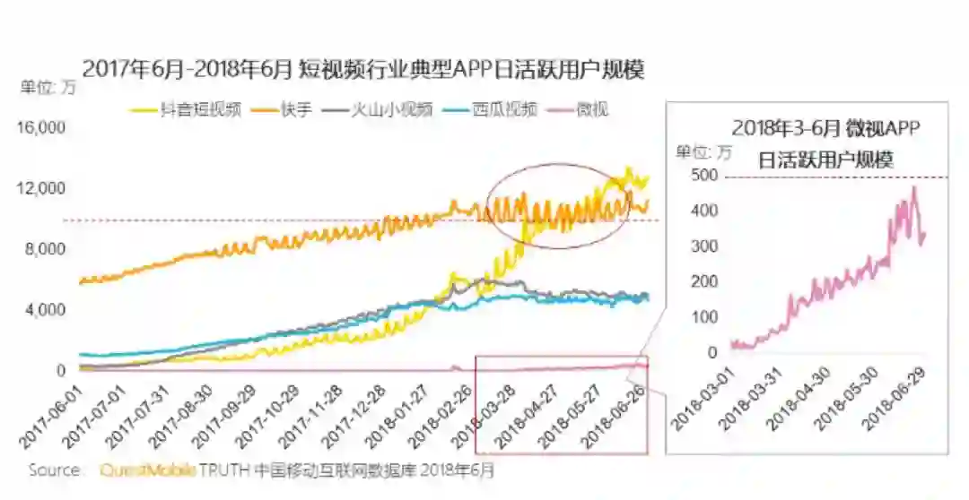 然而,风口上的短视频行业瞬息万变,西瓜视频的高歌猛进并没有持续太久,15秒小视频迅速取代了几分钟的短视频,成为占据用户注意力的新宠。17年下半年,火山小视频的日活数据逐渐赶超西瓜视频,而抖音更是在今年春节的大爆发后一骑绝尘,远远甩开同阵营的两款产品,跟快手进入短视频头把交椅的争夺。