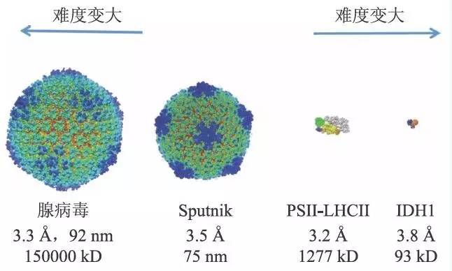 图2 不同类型的蛋白质复合物的冷冻电镜高分辨率结构:腺病毒(EMD-5172),Sputnik 病毒(EMD-5495),PSIILHCII超复合物(EMD-6617),IDH(EMD-8192)。随着样品尺度的过大和过小,蛋白质复合物原子分辨率结构解析的难度增加