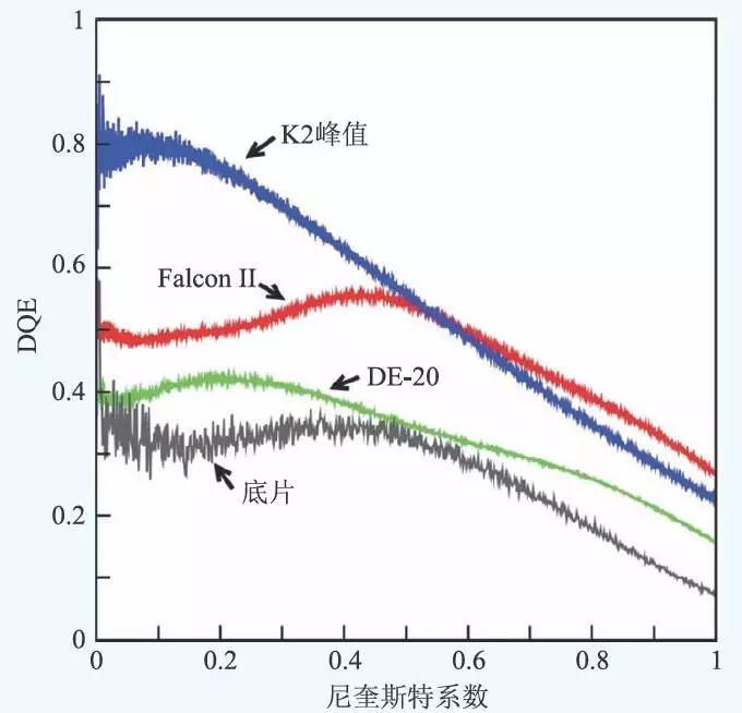 图1 不同相机的DQE。DE20 为绿色,Falcon II 为红色,K2 为蓝色,底片为黑色
