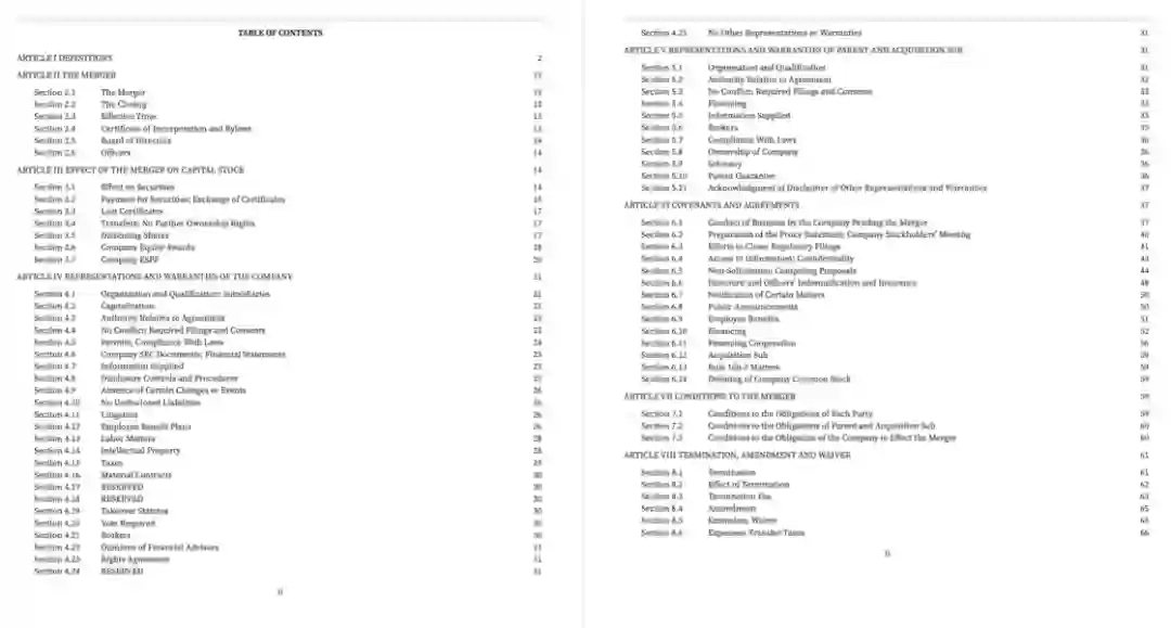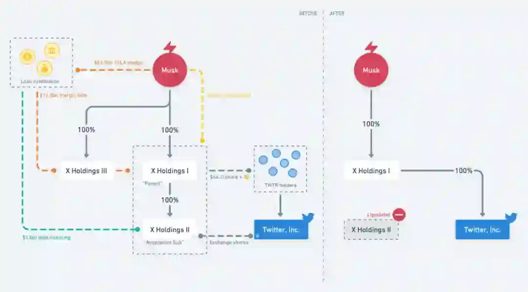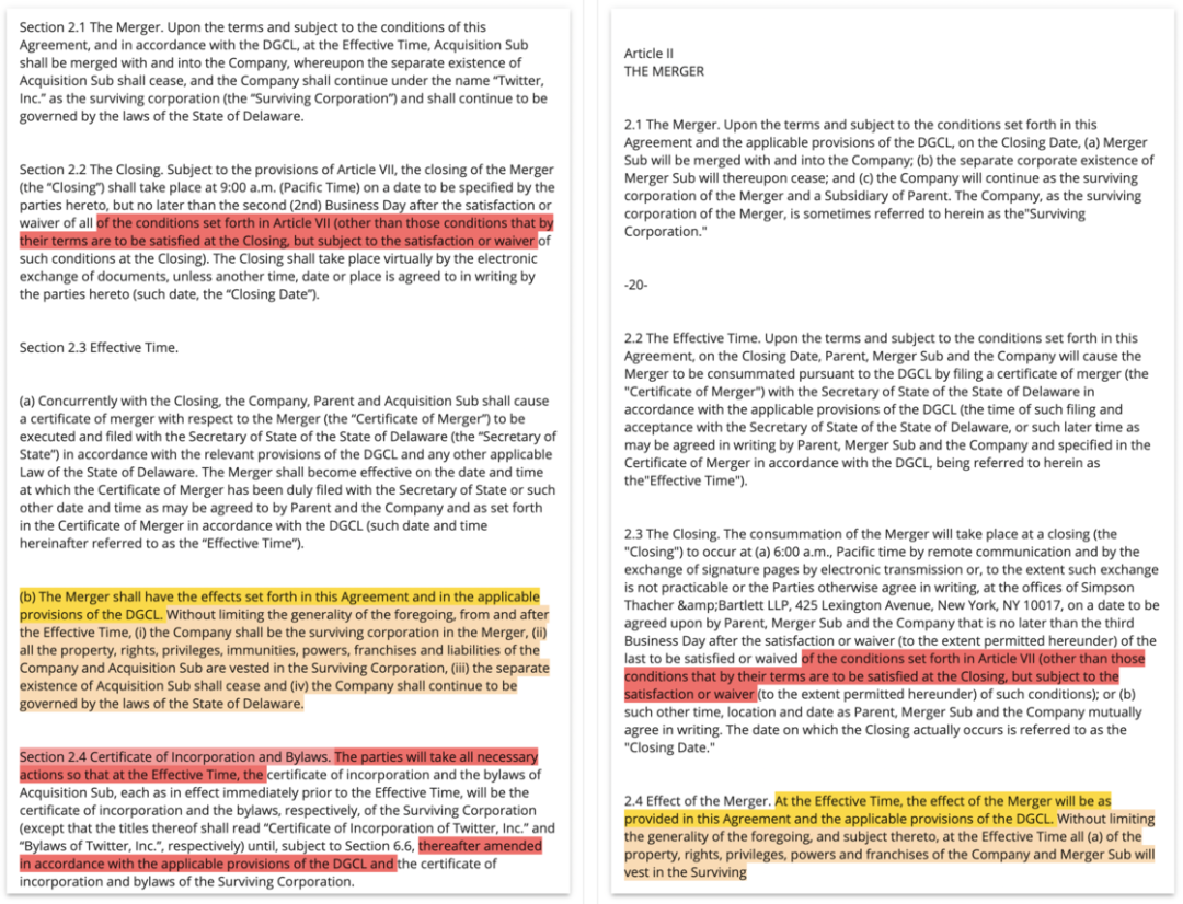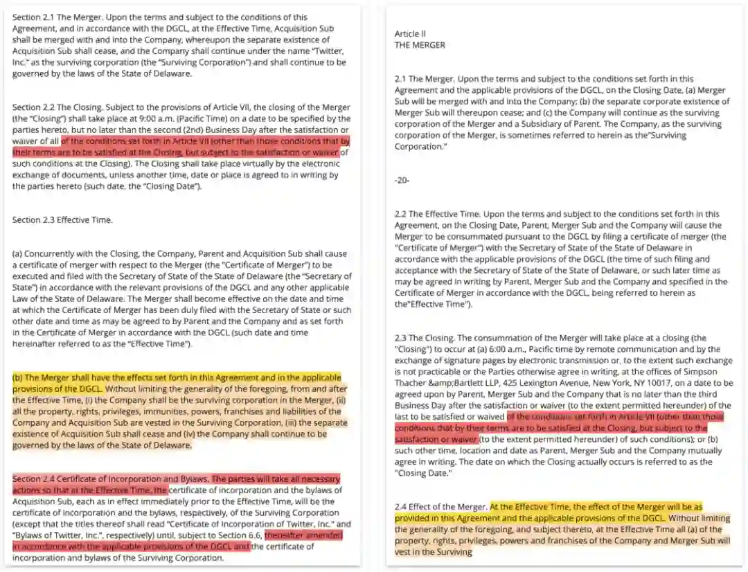 第 2.1 条 并购 。根据本协议的条款和条件,及特拉华普通公司法的规定,于生效时间,收购子公司(编注:即 X 控股二号)将合并及并入公司(编注:即推特运营主体 Twitter, Inc.)。届时,收购子公司将不再独立存续,公司以「Twitter, Inc.」的名称作为存续公司(「存续公司」),继续受特拉华州法律管辖。[…] 第 3.1 条 对证券的影响 。于生效时间,因由并购,且无须公司、母公司(编注:即 X 控股一号)、收购子公司或公司或收购子公司任何证券的持有人的任何行动: (a) 收购子公司股本的转化 。于生效时间,因由并购,且无须相关持有人的任何行动,收购子公司紧邻生效时间之前发行流通的每一股面值 0.01 美元的普通股,将转化为存续公司的一(1)股面值 0.01 美元、完全出资的普通股;该等股份应构成存续公司唯一发行在外的股本份额。 (b) 特定公司证券的取消。每一股紧邻生效时间之前由公司或其任何附属公司持有,或由股权投资者、母公司或收购子公司持有的面值 0.000005 美元的公司普通股(「公司普通股」)将被自动取消、停用并不再作为发行流通的股份存续;前述安排不会引致支付任何对价或付款,亦无须任何对价或付款作为交换。 (c) 公司证券的转换。每一股紧邻生效时间之前发行流通的公司普通股(经取消股份和异议股份除外)将转换为就每股公司普通股不计利息获得 54.20 美元现金的权利(「并购对价」)。根据本第 3.1(c) 条转换为获得并购对价权利的每一股公司普通股将自动取消、停止存续 […]