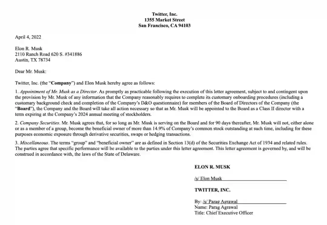 双方需要在对外沟通上保持一致、相互通气,但是,「股权投资者(即马斯克)应被允许发推谈论此次并购和相关交易,只要推文不是在贬低公司(即推特)及其代表」(§ 6.8)。