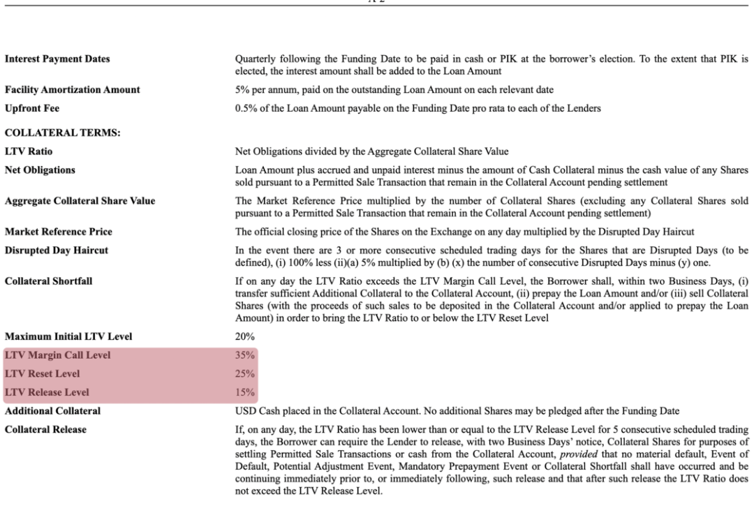 相反,如果 LTV 提升到 15%,即如果特斯拉股票能上涨 57.1%(= 1 - (15% / 35% )),那么马斯克可以提前拿回一些股票。