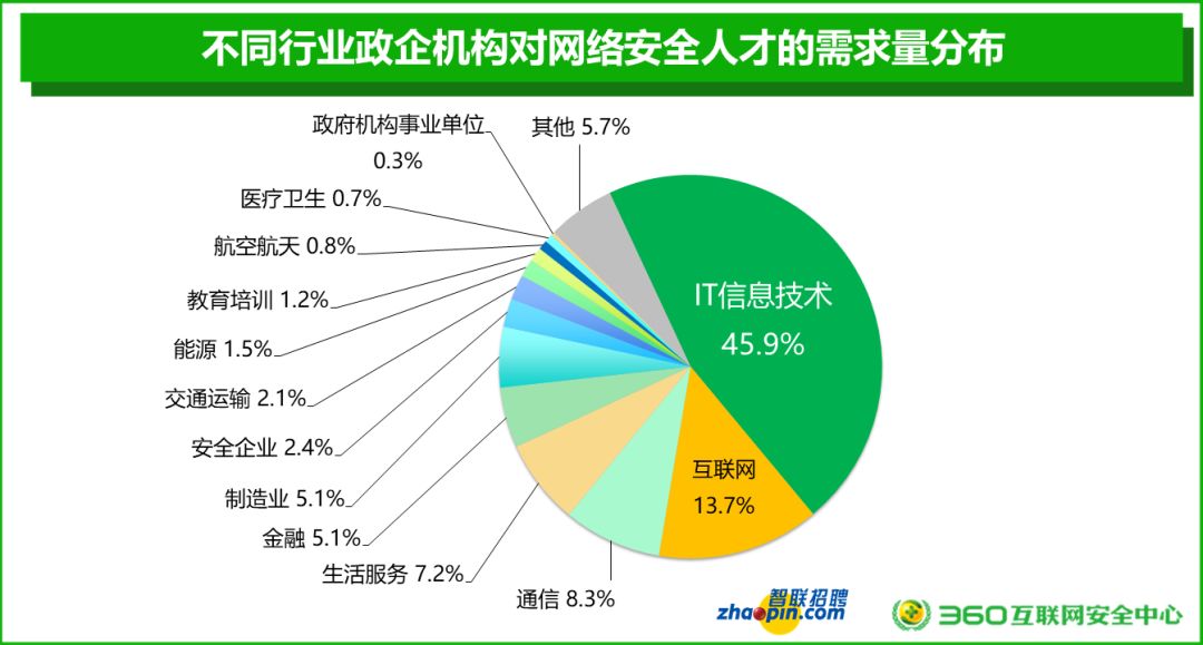 对网络安全人才需求量最大的行业是IT信息技术,招聘数量占所有网络安全人才招聘总人数的45.9%,其次为互联网行业,占13.7%;再次是通信行业,占比8.3%。