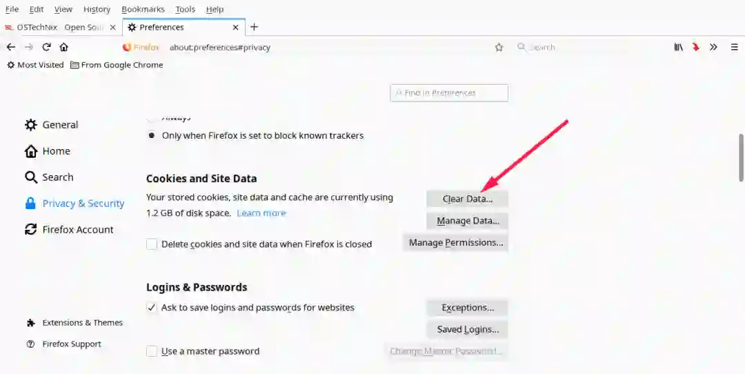 打开 “Edit - > Preferences”,在 “Preferences” 窗口中,打开左窗格中的 “Privacy & Security” 选项卡,单击 “Clear Data” 选项清除 Firefox 缓存。