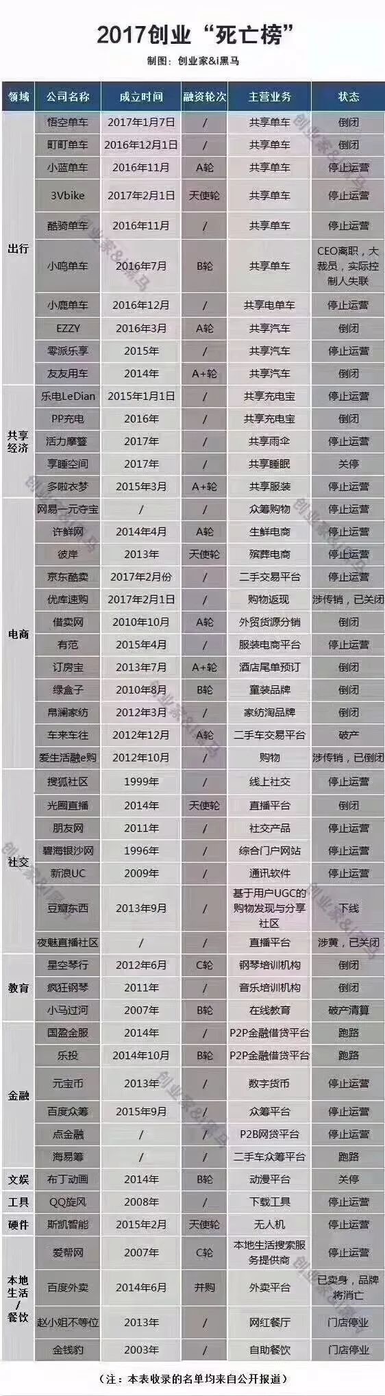 2017年即将结束,上面“创业死亡榜”中,项目的创始人,在启动之时大多饱含热忱,死亡来临前一刻也曾奋力争取生机。但很遗憾,深刻的教训,是他们留下的唯一财富。