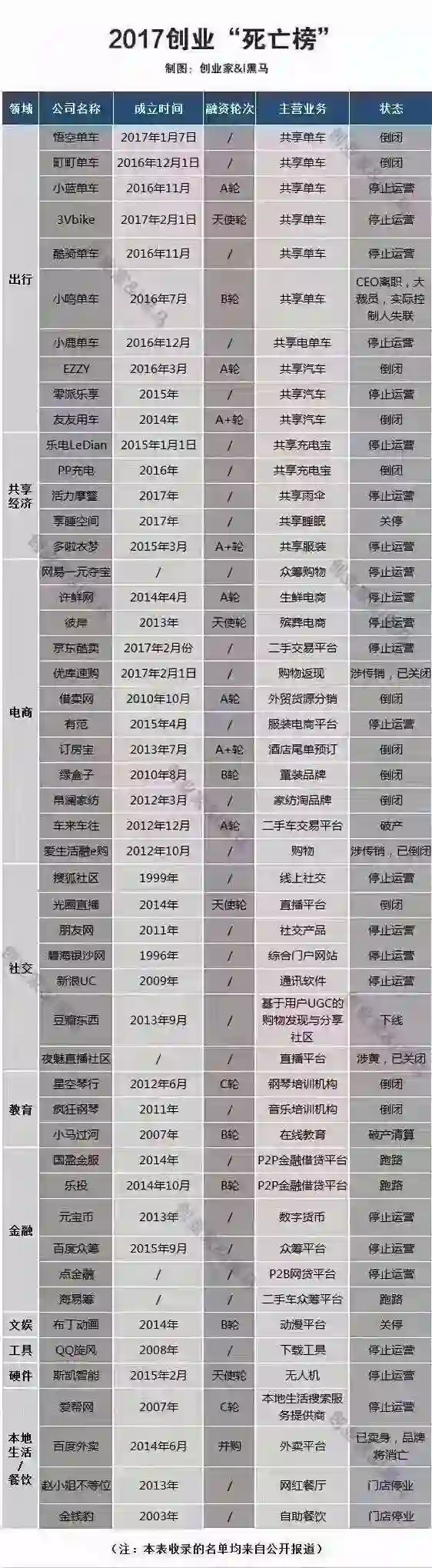 从下面创业“死亡榜”中我们可以看出,与“共享经济”有关的公司所占大半。