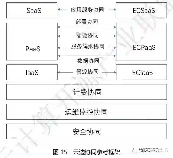 云边协同参考框架主要涉及云计算和边缘计算节点在基础设施、平台、应用三个层面的全面协同, 基础设施层面主要指,IaaS 与ECIaaS 之间需要实现计算、网络、存储等方面的资源协同;平台层面主要指,PaaS 与 ECPaaS 之间需要实现数据协同、智能协同、服务编排协同和部署协同;应用层面主要指,SaaS 与 ECSaaS 之间需要实现应用服务协同。除此之外,云边协同在资源、平台、应用的基础上面还需要考虑计费、运维、安全等方面的协同。