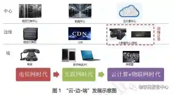 中心-边缘-端,的形态从电信开始之初就已经形成。电信时代,程控交换中心、程控交换机、电话形成了最初的“中心-边缘-端” 形态;互联网时代,数据中心、CDN、移动电话/PC 延续了这种形态;到达云计算+物联网时代,云计算中心、小数据中心/网关、传感器则形成了新的“云-边-端”形态。