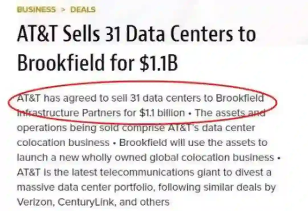 曾经几乎垄断美国数据中心市场的AT&T,在2018年因为业务原因将旗下的31个数据中心卖给了Brookfield基建合伙公司,作价11亿美元。