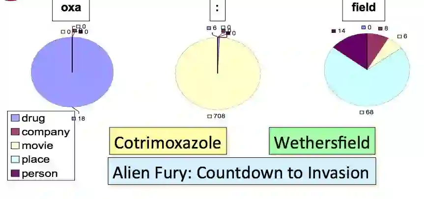 Word substrings (包括前后缀)的作用是很大的,以下面的例子为例,NE 中间有 ‘oxa’ 的十有八九是 drug,NE 中间有 ‘:’ 的则大多都是 movie,而以 field 结尾的 NE 往往是 place。
