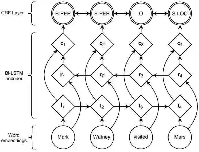 最经典的 LSTM+CRF,端到端的判别式模型,LSTM 利用过去的输入特征,CRF 利用句子级的标注信息,可以有效地使用过去和未来的标注来预测当前的标注。