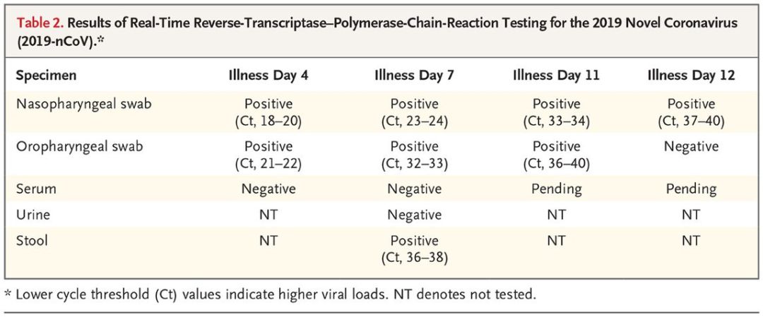 患者发病第 11 天和第 12 天采集的鼻咽和口咽样本显示出病毒载量下降趋势。发病第 12 天采集的口咽样本呈 2019-nCoV 阴性。研究者仍在等待上述日期采集的血清样本 rRT-PCR 结果。