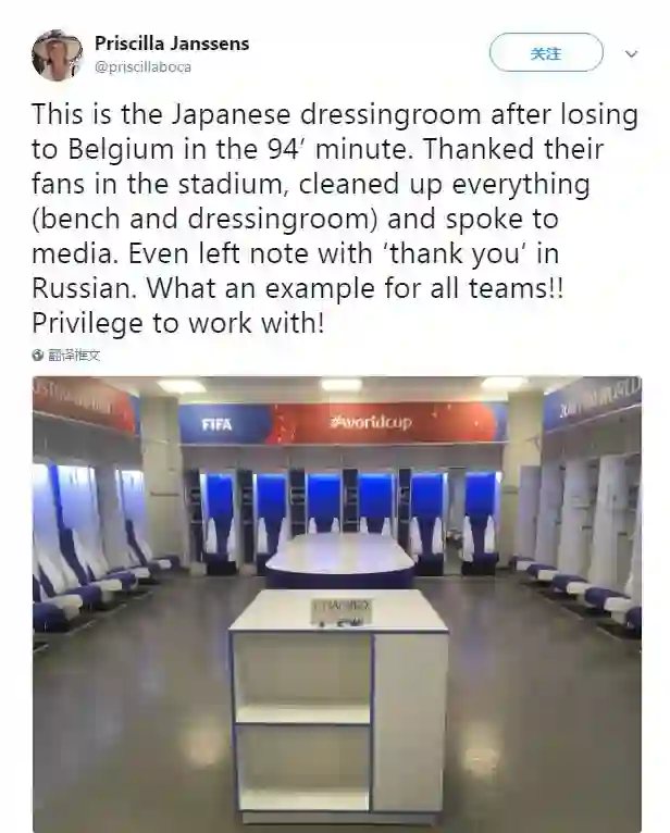 她感慨道:“在第94分钟输给比利时之后,这是日本队的更衣室。然后他们在场内感谢了球迷、清理了所有东西(包括替补席和更衣室)、接受了媒体的采访甚至离开的时候,用俄语写了句‘谢谢’。这是所有球队的榜样!很荣幸跟他们共事!”
