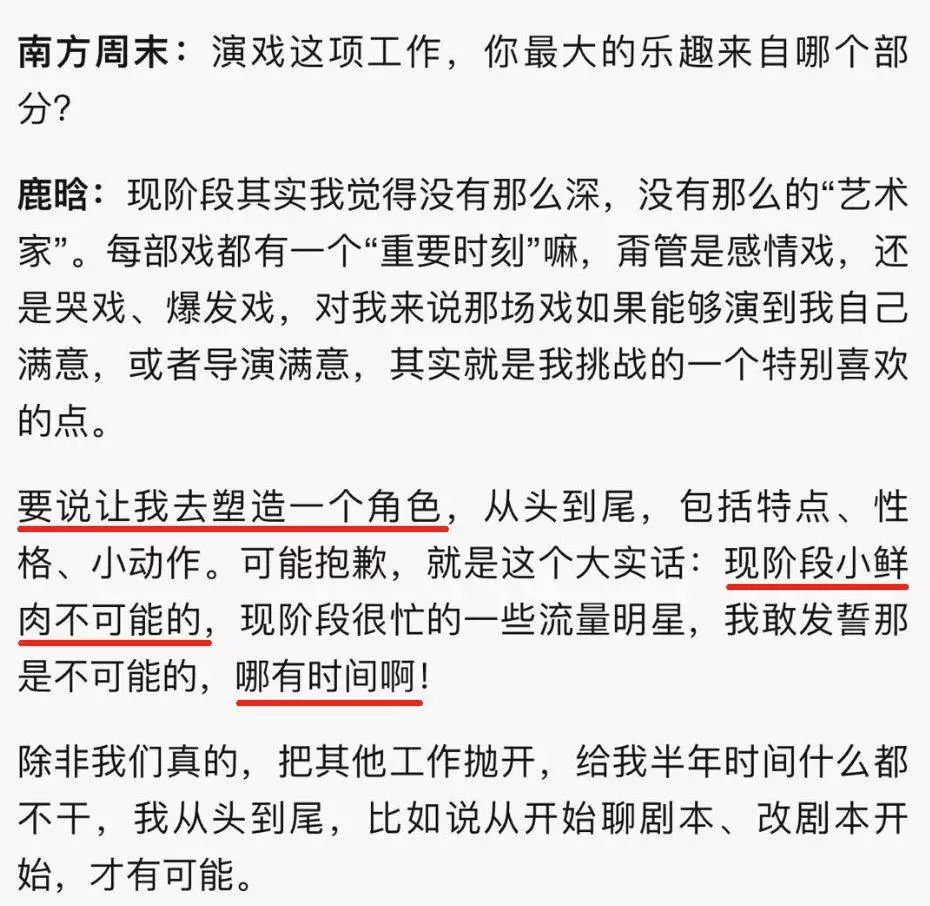 鹿晗曾在几个月前接受南方周末的采访时说:“让现阶段小鲜肉、很忙的一些流量明星去塑造一个完美的角色,是不可能的,没有时间。”“我从一开始就没想过要留下什么,因为太难了……”