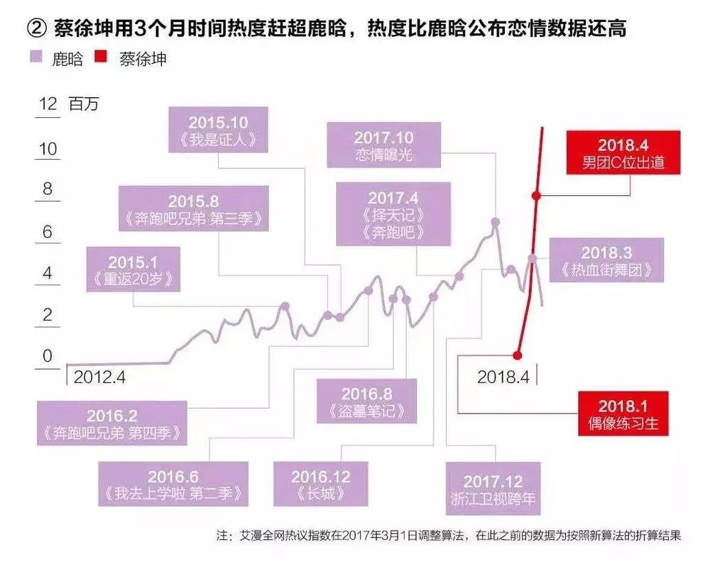 到了2018年,鹿晗已经快被拍死在了沙滩上——蔡徐坤仅用了三个月,就赶超了鹿晗的热度。