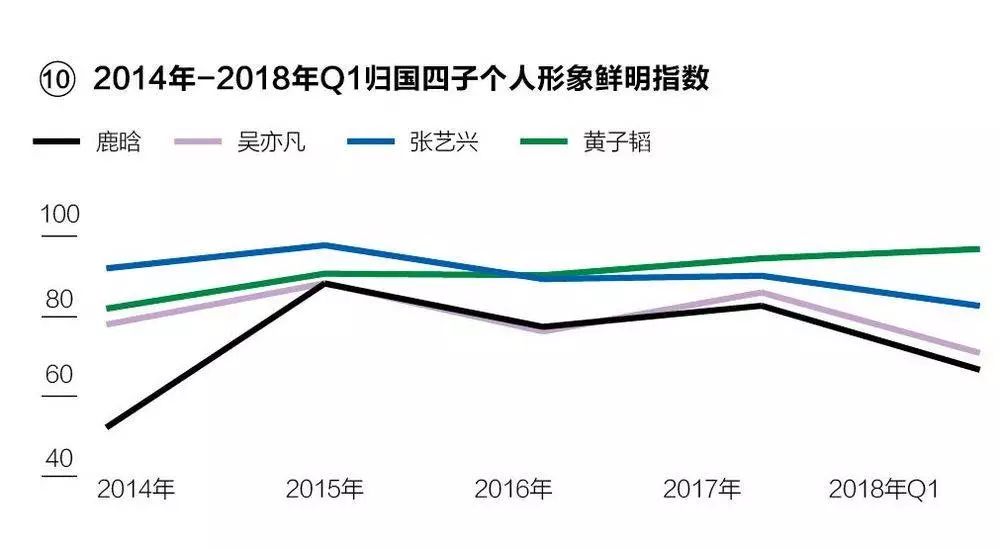 商业周刊(中文版)曾详细分析过“归国四子”的现状:黄子韬个人形象鲜明指数在归国四子中最高,且呈上升趋势,其他三子的形象鲜明指数则呈下降趋势,鹿晗的形象鲜明指数在归国四子中最低。