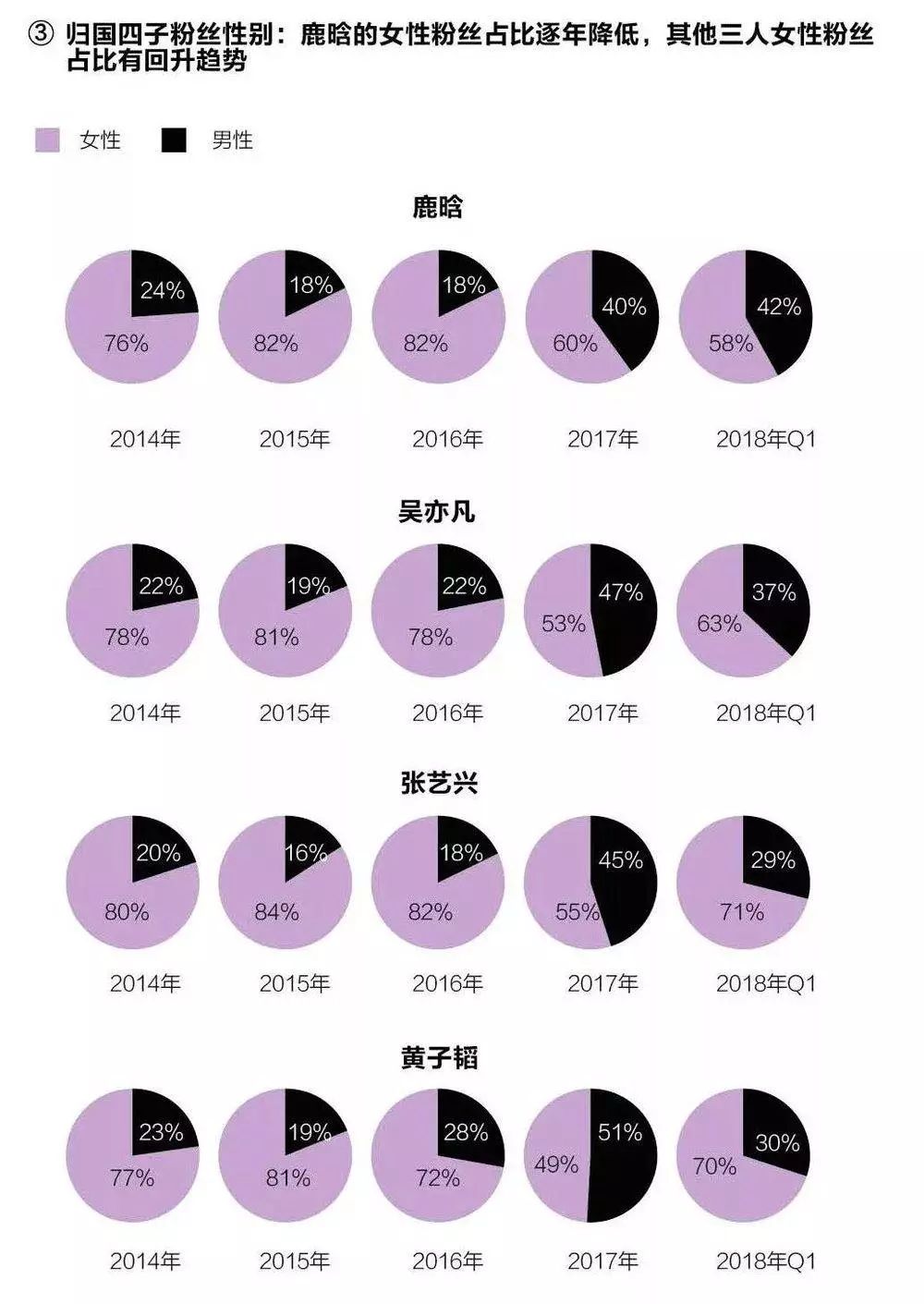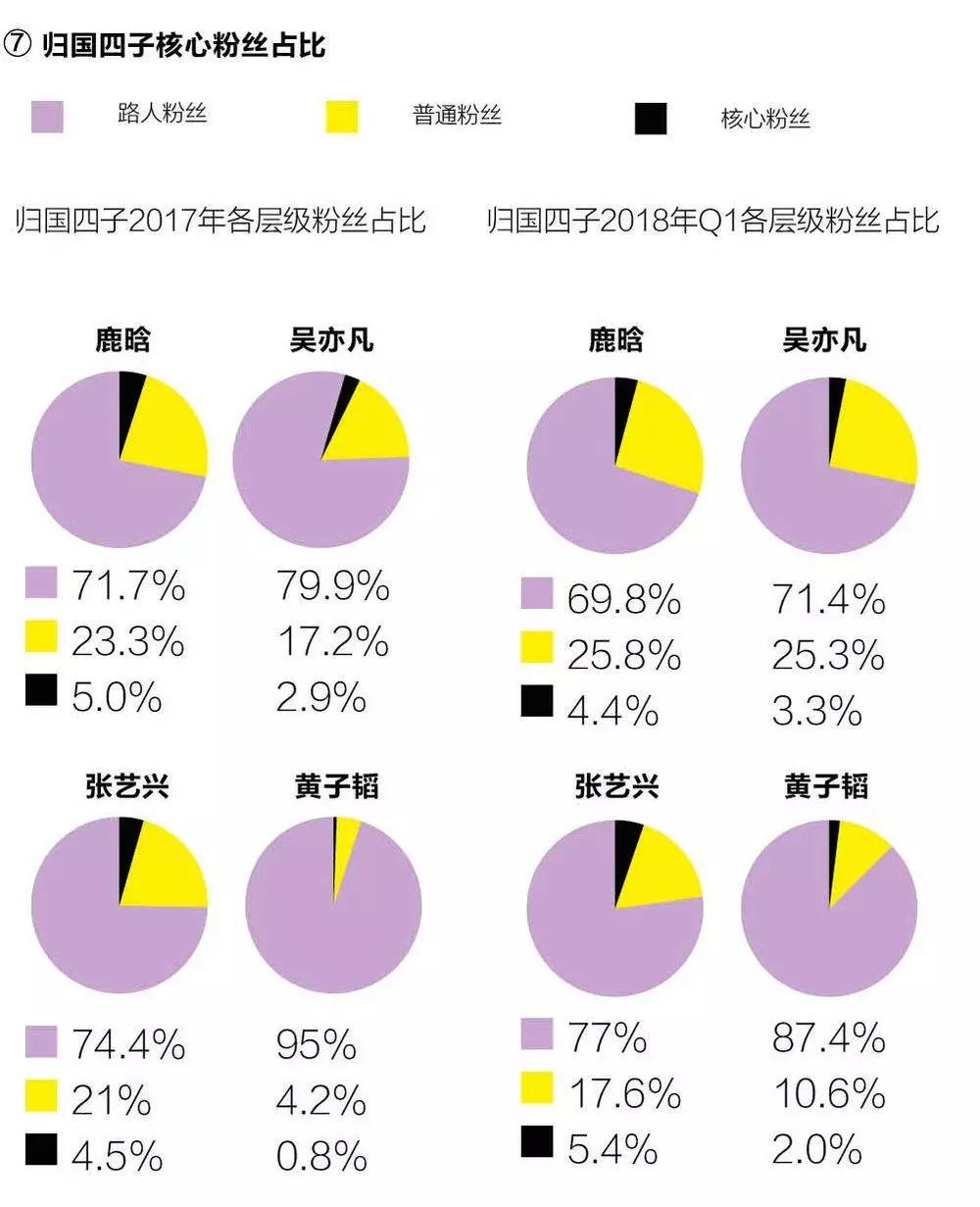 根据艾漫市场中心的统计数据,“归国四子”中,2018年第一季度鹿晗的核心粉丝占比下降,其他三子均有所提升(根据粉丝对艺人情感表达的程度,调查将归国四子的粉丝分为核心、普通和路人粉丝三级))。对于鹿晗这类的偶像明星来说,核心粉丝最最容易转化成市场购买力。