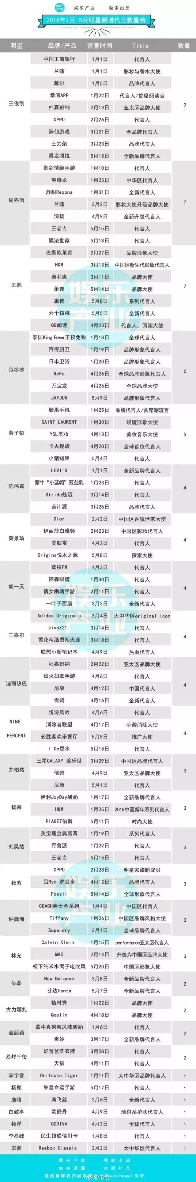 2018年1~5月明星代言榜单。图片来源:娱乐产业