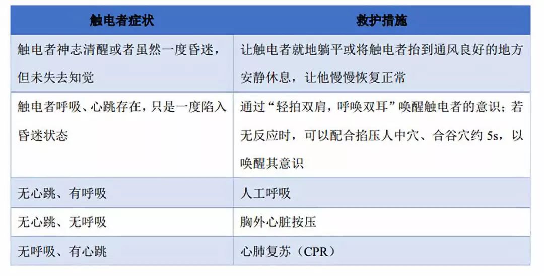 触电者脱离电源后进行简单诊断,观察触电者瞳孔是否扩大,有无呼吸,颈部的颈动脉有无搏动等明显生命体征。如触电者尚未失去知觉,则应让其静卧,注意观察,请医生来诊断。常见的救助措施见置顶评论(下表有误)。