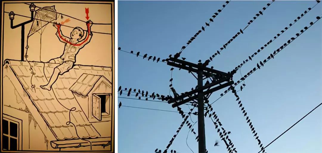 右图:落在单根电线上的小型鸟类很难发生触电事故(图片来源:Photo credit- frankieleon on Visual hunt / CC BY))