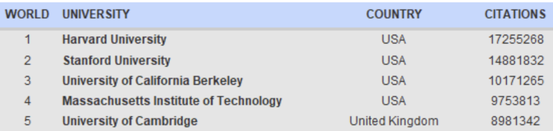 2022年2月4日,2022全球大学谷歌学术影响力排名最新出炉。根据该排名2022 年 1 月的 13.0.2版,哈佛大学、斯坦福大学、加州大学伯克利分校、麻省理工学院和剑桥大学位居世界前5名。中国内地排名最高的是清华大学,位居世界第101名。